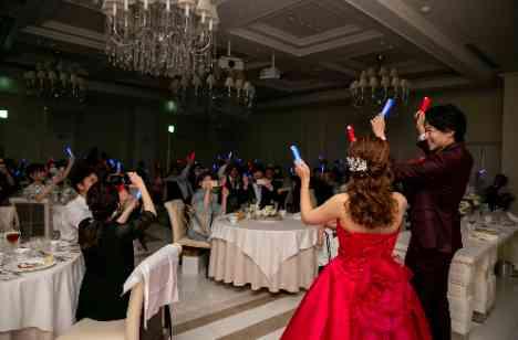 お色直し入場! 入場後には、お二人のゲストも楽しみにしているお二人のお子様の性別発表。 今回はサイリウムを用いて性別予想をゲストにして頂き、正解者にプレゼントをご用意いたしました! 正解は赤いサイリウムで予想頂いた「女の子」! 結びのシーンでは親御様に感謝のお気持ちをお伝えし、新郎様からは新婦様へサプライズで花束のプレゼント!