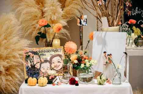 披露宴会場は秋らしいオレンジや赤茶色、パンパスを中心にコーディネート。 ウェルカムスペースにはカボチャも飾ってハロウィンの雰囲気も入れ込みました。 友人スピーチやケーキ演出、中座のシーンなど涙あり、笑いありの思い描いていたアットホームで素敵な時間をお過ごしいただきました。 お手本バイトで親御様にもご参加いただき会場も温かい雰囲気に包まれました!