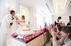 "こちらのウエディングケーキはお子様が選んでくださいました!ハートの大きなケーキでDaikiさんにバイトを! Nanaさんの取ってくださったケーキはとっても大きかったです♪"