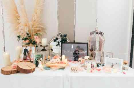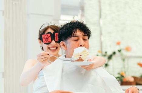 披露会場はオレンジやアプリコットをメインに白グリーンを入れてグラデーションコーデに仕上げました。 乾杯のあとはたくさんのゲスト様がおふたりの元へお祝いにかけつけてくださいました。 新婦様こだわりのケーキも登場し、まさかのファーストバイトは二人羽織! おふたりご準備のサングラスをかけてバイトを行いました!これにはゲストのシャッター音や二人を応援する声で会場の盛り上がりは最高潮に!!