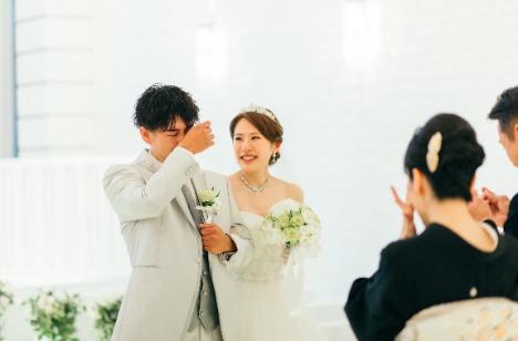挙式が始まる前、まずはおふたりの姿を一番に見ていただきたかったご家族に向けてのファミリーミート! ご家族とのご対面にまさかの新郎様も涙、、、感動的なシーンとなりました。 アフターセレモニーでは新婦様によりコスメブーケトスや幼いころからサッカーをされていた新郎様よりサッカーボールトスを行い会場全体が大盛り上がりでした!