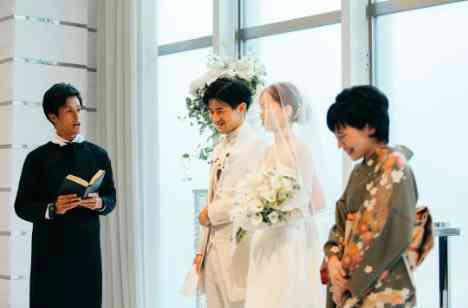 挙式の新郎様入場は笑いをとりたいと、サッカーの入場曲をチョイス。 その後はお母様にジャケットセレモニーを行っていただき、挙式がスタートしました。 和やかな雰囲気の中、新婦様もご入場。 立会人にはおふたりのキューピッドでもあるご友人様方より、内容は新郎新婦へはサプライズでご準備してくださり、笑顔あふれる誓いの言葉となりました。