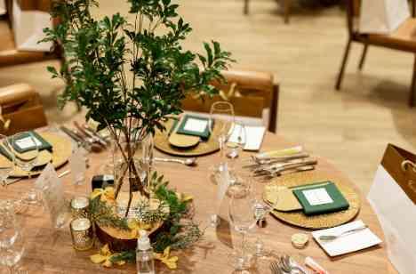 披露宴会場も新婦様こだわりのコーディネート! また、こだわり演出もたくさんご準備されました。 まずは、ケーキ入刀の代わりにからあげタワーをご用意。 ファーストバイトも通常とは違い、ゲスト様にもご参加いただき 二人羽織でバイトをし盛り上がる演出となりました。 再入場もおふたりらしく新郎様はマイク片手に、新婦様は撮影をしながら入場となりました。
