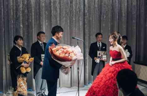 ご準備をメインで進めていただいておりましたご新婦様に ご新郎様から「準備ありがとう!」「今日はとってもかわいいよ!」普段なかなかお伝えされないという言葉を結婚式だからお伝えされてみてはいかがですか? とお話しさせていただき、予想外のおっきなお花束とともに感謝のお気持ちをお伝えいただきました。 ご新婦様も予想外だったのか満面の笑みと驚きでご館されるまで大事に大事にされていらっしゃいました。
