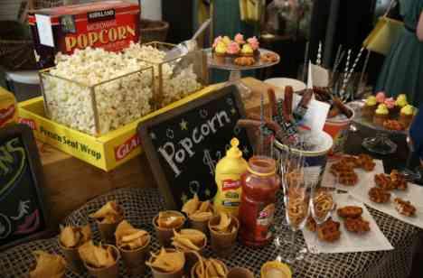 アフターセレモニーまでは結婚式のテーマは1950‘sレトロのみ。 エレベーターの扉が開くとともにゲストの方から「ポップコーンのにおいがする…」とざわざわ。映画に欠かせない、できたてあつあつ香ばしい香りのポッポコーン、サルサソースと共にナチョス、あったかいチュロスをウェルカムフードとしてご用意しました。ドリンクはレトロチックなビ瓶コーラ、瓶ペリエ、EXコールドビールを。。。