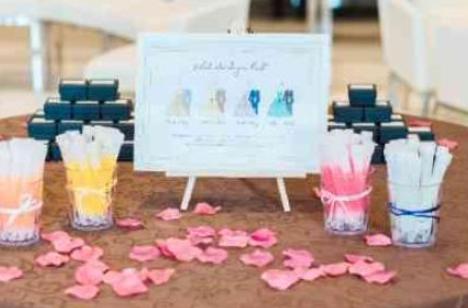 ウエルカムスペースには、MOMOKAさんが再入場で着る「ドレス色当てクイズ」を設置。ゲストが気軽に参加できるだけでなく、披露宴での再入場をワクワクしながら見守るのが魅力的です♪おふたりは、暗いところで光るペンライトを選択肢の色に合わせてご用意しました。ゲストには選んだ色のペンライトをお色直し入場の際に点灯し振ってもらい、カラフルなペンライトでおふたりの入場はライブ会場のように大盛り上がりでした☆