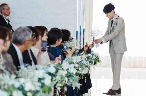 事前にゲストに配っておいた花を、ご新郎様が入場する際にゲストから集めてブーケにし、ご新婦様に贈る「ブーケ・ブートニアセレモニー」をゲストの皆様にご協力してもらい行いました。MOMOKAさんの大好きなかすみ草の花束を完成し、再プロポーズ♡ロマンチックなワンシーンに加えてゲストも参加できるため、会場全体に一体感が生まれとても素敵な感動的なシーンとなりました。