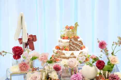 会場の装花だけではなく、ウエディングケーキにもこだわりとても可愛い仕上がりに♡ そして、乾杯後おふたりのケーキ入刀とファーストバイトへ。 結婚生活に対する想いが込められているファーストバイトのセレモニーでは、新郎様は大きなスプーンで挑戦! お二人のお姿に会場からも歓声があがり、とても盛り上がりました。