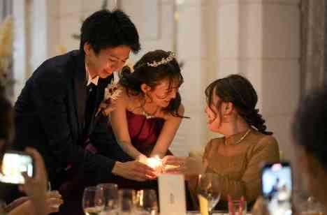 エンディングではクライマックスにピッタリなキャンドル演出を行いました。今までとは全く違った雰囲気となり、おふたりの結婚式もクライマックスへ。各テーブルへおふたりが行き、キャンドルの光を繋ぎ会場全体はとても暖かい光に包まれました。そして会場全体がロマンチックな空間となり、その中で両親へお手紙を読む新婦様のお姿に会場全体が涙と笑顔でいっぱいになりました。