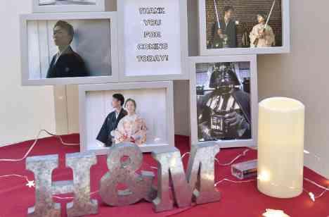 おふたりが大好きな映画のテーマに合わせて、星と光をところどころに使用しこっちにも星、あっちにも星、どうしても、どうしてもオープニングムービーに使いたかった曲は会場バックに映し出される大きい光と共に演出!テーマを120%フルマックスで再現しましたね。おふたりにご用意いただいたガウンやライトセーバー、御面も大活躍でゲストの方々にもお楽しみいただけました♪