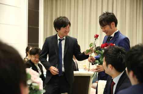 まずご新郎様にご入場いただき、愛情・栄光・感謝など12の意味が込められた12本のバラを選ばれたゲストの方から集めながら、なぜその言葉を選んだのかを司会者よりひとりずつ紹介させていただきました。 そしてイエローのドレスに包まれたご新婦様を会場内にお迎えしました。 ご新郎様からのお気持ちの込もった一言と、集めたバラの花束がご新婦様に贈られ、 温かい感動の空気に包まれ、素敵なシーンとなりました。