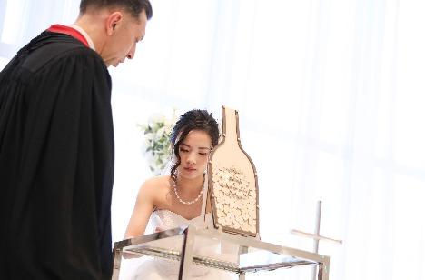 お母様とも一生の晴れ舞台を歩きたい。 その想いを胸にご新婦様はバージンロードの前にお母様のお腹の中を意味するマザーズロードを歩かれました。 またお子様演出では、リングボーイに登場頂き お二人の大切な指輪をしっかりとお二人の元に届けてくださいました。 受付ではハートドロップスを配り、 ゲストの方々に世界で一つだけの「結婚証明書」を作って頂き お二人にも署名としてドロップして頂きました。