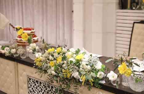 会場装飾はご新婦様がずっと楽しそうにデザインしてくださった、スモーキーアンティーク調。ポイントでイエローを添えることで、華やかな印象を与えてくれる装飾に。 またゲストの方々をお迎えするテーブルには、ご結婚式の中で唯一自然な光が生まれるキャンドルと、活けこみをデザインされた装飾を施しました。