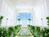 お花を敷き詰めたフラワーバージンロードが美しいクリスタルチャペル。スワロフスキー社製のシャンデリアがおふたりを照らします。窓の向こうには抜けるような青空が。誓いの場に進む花嫁の姿は思わず息を飲むほど感動的です。