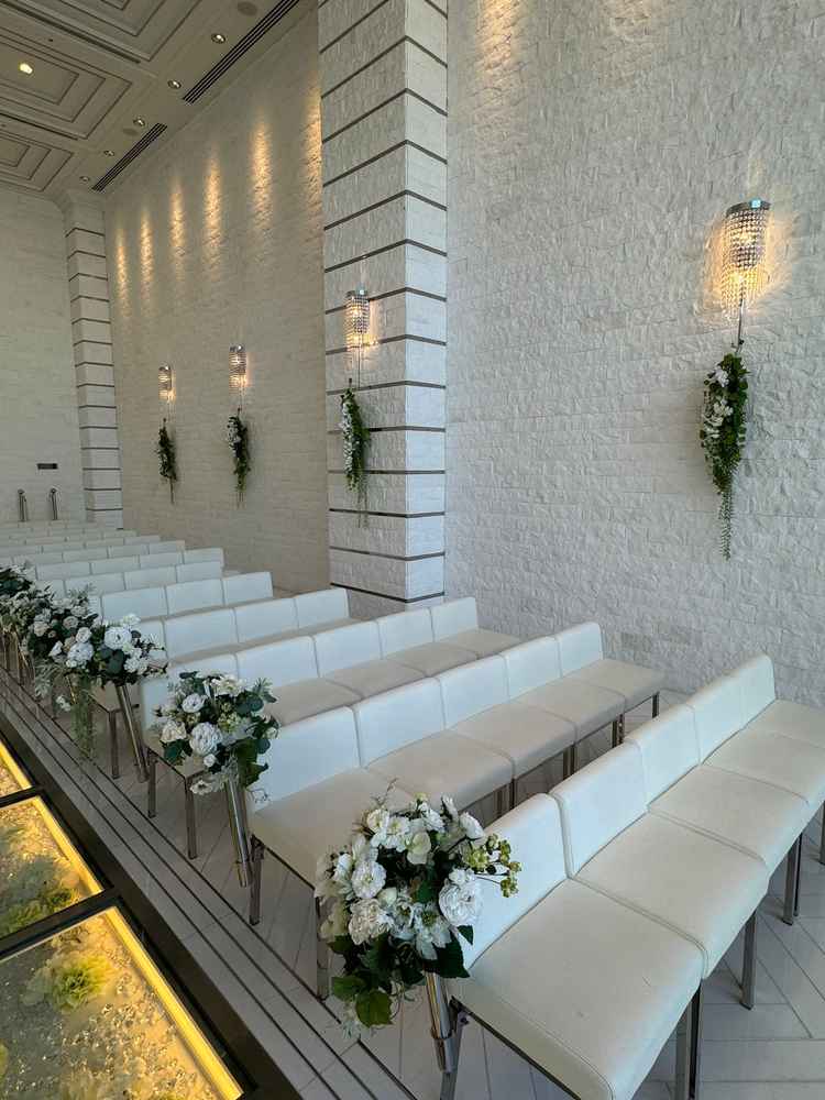 白基調で上品は雰囲気が好きな方にはマッチすると思う。披露宴会場の階段と、挙式後のフラワーシャワーの階段この色味が好みだった。(ロイヤルブルーとブラウン)