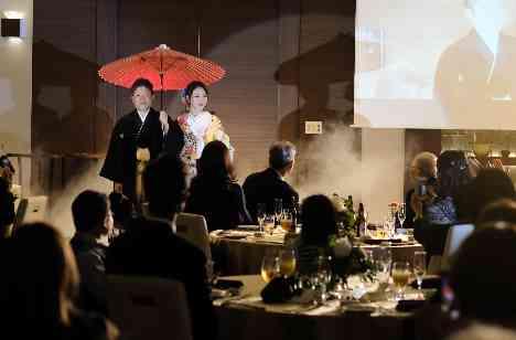 バーカウンターでふたりのために作られた特製カクテルで乾杯し披露宴はスタートしました。和装での入場やケーキ入刀とファーストバイトなど、巨大スクリーンでライブ中継していただきました。会場の後方にも画面があり、どのゲストにもしっかりと見てもらえてよかったです。