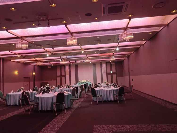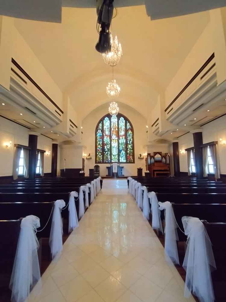 チャペルは一枚の広いステンドグラスが珍しかったです。すごく驚きました。披露宴会場の照明はデコレーションが豊富で予想以上に驚きました。