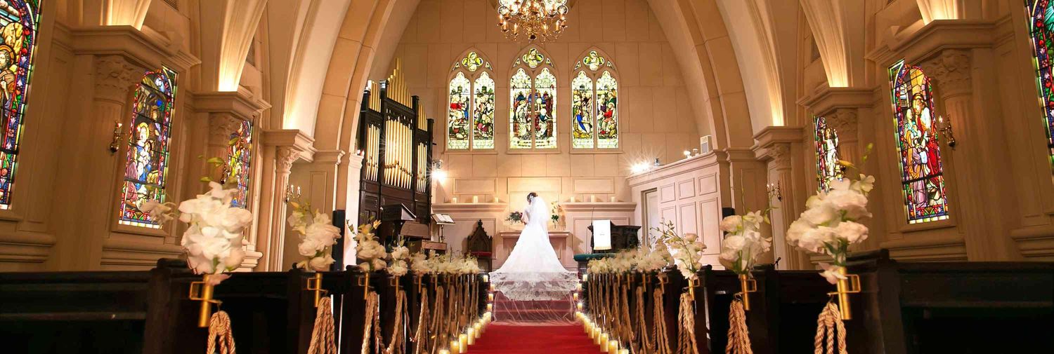 長さ22mの深紅のバージンロードが印象的な大聖堂荘厳な中にも温かい雰囲気が漂っています 130年もの歴史あるパイプオルガンの旋律がゲストを感動で包み込みます