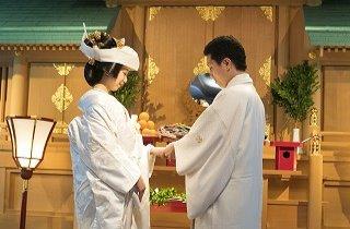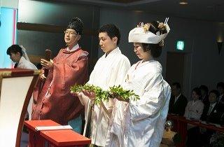 出雲大社から御霊分けされた本格的な神殿で誓う、古式ゆかしい神前式。 凛々しい紋付袴の新郎と、華やかな白無垢に身を包んだ新婦が、参道を通って神殿へ。三三九度や誓詞奏上といった伝統の儀式で、ふたりは夫婦になる契りを結びました。
