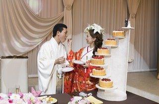 挙式と雰囲気をがらりと変えた色打掛での登場に会場が沸き立ち、ケーキ入刀にファーストバイトと大盛り上がり!