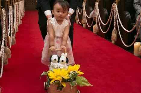 挙式ではなんと小さなお子様が大活躍♪ スヌーピーのリングピローならぬリングカートを 押して入場♪♪ 可愛いお子様の登場にゲストもほっこり♪ 挙式の後はトスも行いました♪♪トスはカップラーメンのブーケを使いゲストは大爆笑でした♪
