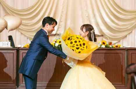 披露宴もそろそろおひらきとなり、おふたりから親御様へ感謝のお手紙をお読みになりました。その際に、ご新郎様からサプライズで今回のテーマである"ひまわり”の花束をご新婦様へお渡しをしました。ご新婦様に気づかれない様にスタッフと念入りに打合せを行い、無事大成功!ご新婦様もとても喜んでいただき、感動の中披露宴はおひらきとなりました。