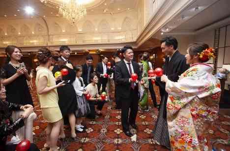 再入場ではバルーンスパークを* 各卓にある大きなバルーンを割っていく演出です。割ると中からカラフルなバルーンがでてくるのでより一層華やかに** 当たりのバルーンをつかんだゲストにはなんと・・ お二人からプレゼントが!! 参加型の演出にゲストも大盛り上がり♪
