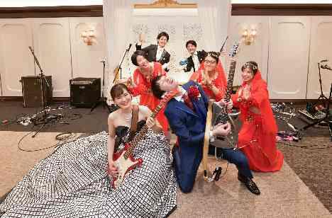 音楽を通じて知り合ったゲストたちが参加する結婚式だから、音楽の演出には力を入れたいと考えた新郎新婦。再入場にはギターとベースを抱えて登場!バンド仲間とのライブ演奏では、サイリュウムを振って大盛り上がりのゲスト。親族や友人たちとの絆もさらに深まる楽しい結婚式に!