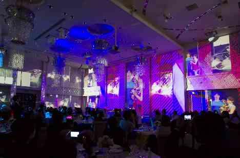 お二人が初回ご見学時に絶賛なさった演出が「プロジェクションマッピング」でした。当館のマッピングは披露宴会場の中、360度に映像が出せるのが特徴です。マッピングに使うお写真も当館で撮影しますので、新郎様は「スーツ」と「テニスウェア&ラケット」、新婦様は「白衣に聴診器」と「チアリーディング」と職場や趣味の衣裳をチョイス。お二人のお写真が投影されて両人入場!ゲスト様も皆様笑顔で、楽しめたようです。