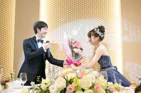 ご友人様から余興の中で、新婦様へサプライズを計画。まずはDVD上映。その映像に新婦様が気を取られている間に新郎様もこっそり退席。映像が終わり明るくなると新婦友人のダンスがスタート。それだけでも新婦様は驚いていましたが、ダンスの終盤に新郎様が入場扉から現れ、手には花束が!メインテーブルで新婦様に花束をプレゼントし、サプライズ演出は大成功!余興のお打合せやサプライズ相談もお気軽にプランナーまでどうぞ。