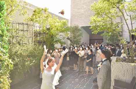 ゲストの皆様に承認を貰い、晴れてご夫婦になった後はインナーガーデンにてフラワーシャワーをし、ゲストの皆様からの祝福を受けることができました。その後はブーケトスならぬ「コスメトス」の実施。ブーケトスだと参加しずらかったりしますが、コスメだからこそ女性ゲスト全員にご参加いただき、実施いたしました。青空の下でゲストの皆様と楽しく過ごすことができました。