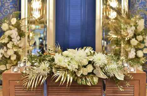 ビジュアルイメージは「Stylish&Elegant」。このイメージに沿ってフラワーデコレーターと共に打合せをし、会場装花を決定しました。ホワイト・グリーン・ゴールドのカラーでまとめあげ、高砂テーブルのサイドにもデコレーションを施し、華やかに。ゲストの皆様も沢山お写真と撮っていただき、「良かったよ!」と言って貰えて嬉しかったです。