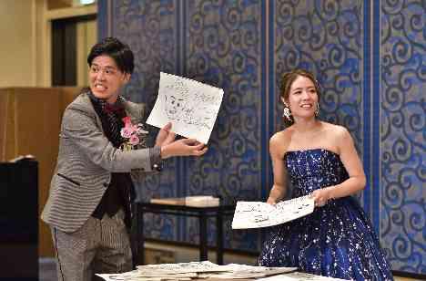 余興の代わりにゲームを用意しました。その名も「似顔絵chance!」テーブル対抗で1人1パーツずつ新郎新婦おふたりの似顔絵を書いてもらうというゲーム。優勝者には賞品もご用意しました。限られた短い制限時間の中で似顔絵を書きつつ、出来上がった似顔絵に新郎新婦、ゲストもコメントするなど盛り上がった時間でした!