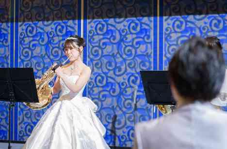 学生時代に吹奏楽部員だった新婦様は、今でも楽団に入り、楽器を演奏をされていらっしゃるとのこと。演奏中は新郎様もすぐ近くで温かく見守ってくださり、会場全体が笑顔と和やかな空気に包まれました! 新婦様のお好きな音楽に乗せて、ゲストの皆様への感謝のお気持ちをお伝えされる、おふたりならではの演出でございます♪