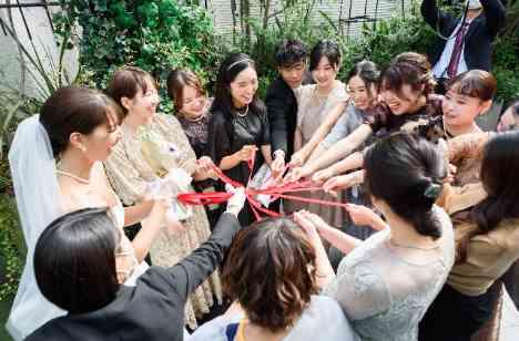 挙式後は新婦様からご友人の皆様へのプレゼントタイム♪コスメブーケにリボンをつけて、皆様に引いて頂きました。リボンを1本ずつ手に取りながらドキドキする瞬間は、新婦様もゲストの皆様も自然と笑顔になってしまいます。見事運命のリボンを引かれたゲストは新郎新婦様と記念のお写真も♪挙式の神聖な空間からメリハリをつけて、一気に盛り上がる瞬間でした。