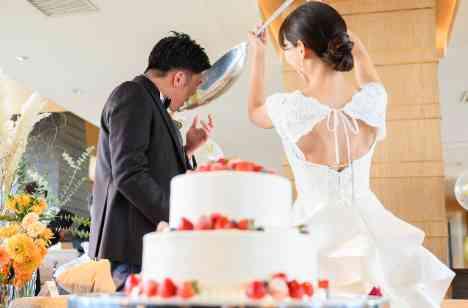 ケーキ入刀、そしてファーストバイトのお時間。最初は小さなスプーンが運ばれてきましたが、司会者より「サイズを間違えたようですね」とハプニングのアナウンスが!続いてスタッフがお持ちしたのは超ビッグスプーンです★ゲストの皆様も大盛り上がり!新婦様は全力で新郎様のお口へケーキを運んでくださいました!会場が一体となって新郎様を応援する、温かいお時間となりました♪