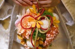 凛とした空気が澄み渡る厳かな神殿の中で、伝統を大事にと白無垢での神前式。 ヘアスタイルは綿帽子ではなく、あえて洋髪に。 モダンなスタイルはご親族の皆様にとっても新鮮なご様子でした。 白無垢に合わせ作った鞠ブーケも、とても印象的でした。