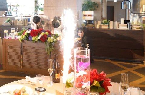 お二人はウェディングドレスにお召し変えをして再入場。 その際、ゲストテーブル全席に飾ってあった花火が 一斉に会場にあがるという演出。 後半の幕開けの瞬間を盛大に飾りました! ゲストの皆さんの「おおお~!!」の感動が忘れられませんね。 パーティの温度感も更に高まりました。