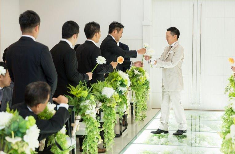 挙式は人前式で、ダーズンローズセレモニーを行いました。 ゲスト12人に一輪ずつお花を持ってもらい、新郎様入場のタイミングでお花を渡してもらいました。 この12本には「感謝」「愛情」「尊敬」などそれぞれ意味が込められています。 ゲストの想いもしっかり受け止め、花束と一緒に新婦様に想いを伝えた時、皆さんからの祝福の拍手が響き渡り全員が感動に包まれました。