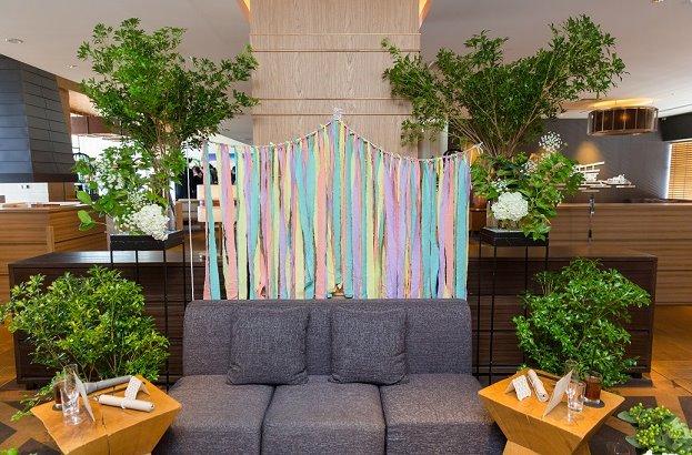 ゲストとの距離が近くてアットホームな雰囲気を大事にしたいと、 あえておふたりの高砂はソファー席にしました。 装飾にも拘り、ツリーをたくさん入れることでナチュラルな雰囲気になりました。 ゲストの反応も良く、お二人が中座中はフォトスポットとしても賑わっていました。