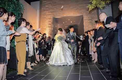 ちょうど夕方スタートの挙式だったおふたり。 幻想的な照明がおふたりを照らします♪ ナイトウェディングにも映える様な華やかなドレスと キラキラ光り輝くフラワーシャワーは まるでペガサスの輝く羽根のよう!