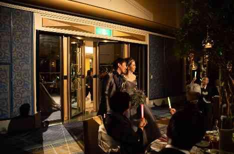 お色直し再入場の演出には「ドレス色当て」を選ばれたおふたり。 定番の演出も、光るサイリウムを使うことで 会場内がこんなに素敵な雰囲気に! それぞれのサイリウムの色が夜空の様々な星の色を表現しました☆ 会場内の鏡張りのドアにも反射してとてもキレイに!!