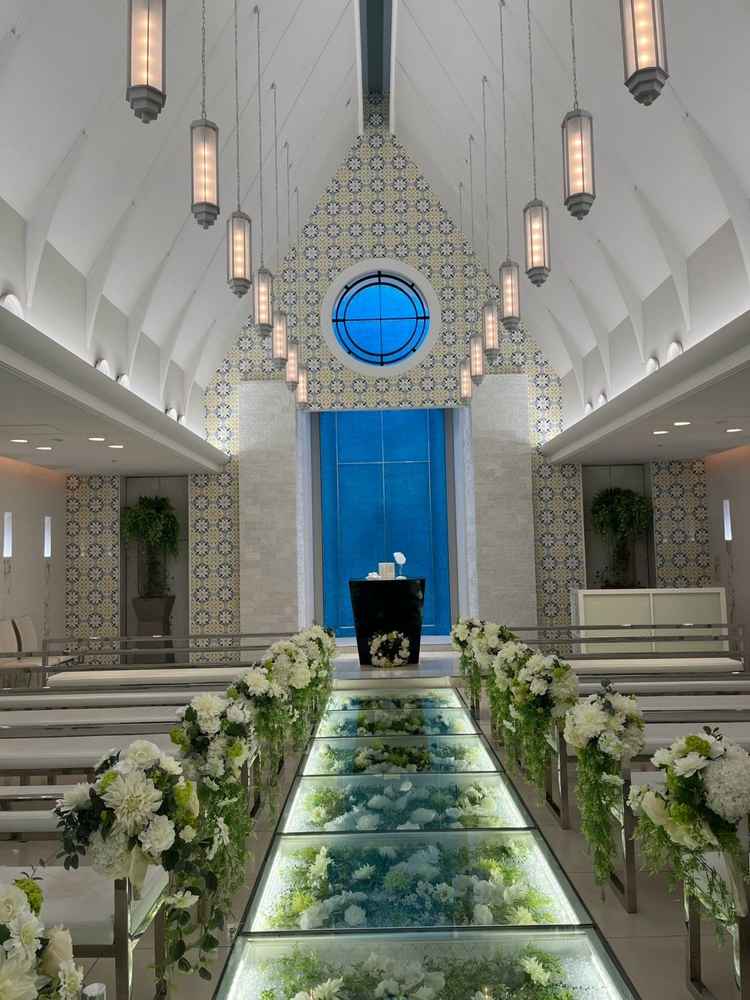 ナチュラルな雰囲気で良かった。チャペルも白基調でかわいく、ガラスのバージンロードも良かった。ただバージンロードが短くやや、手狭に感じた。