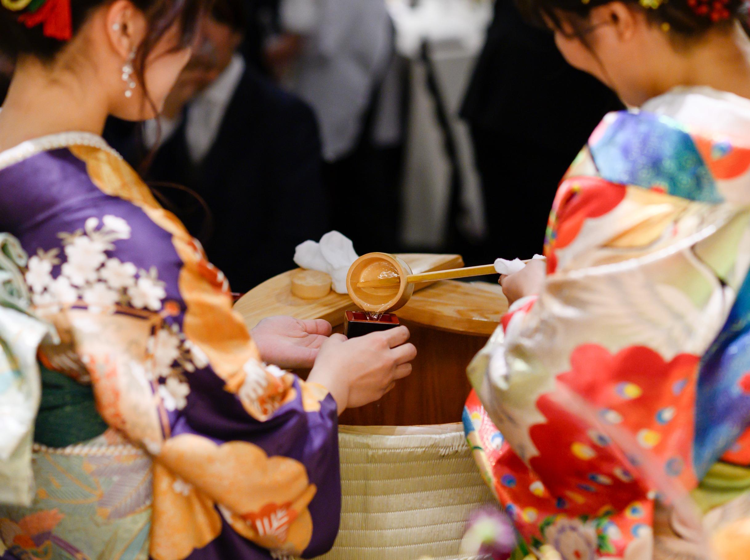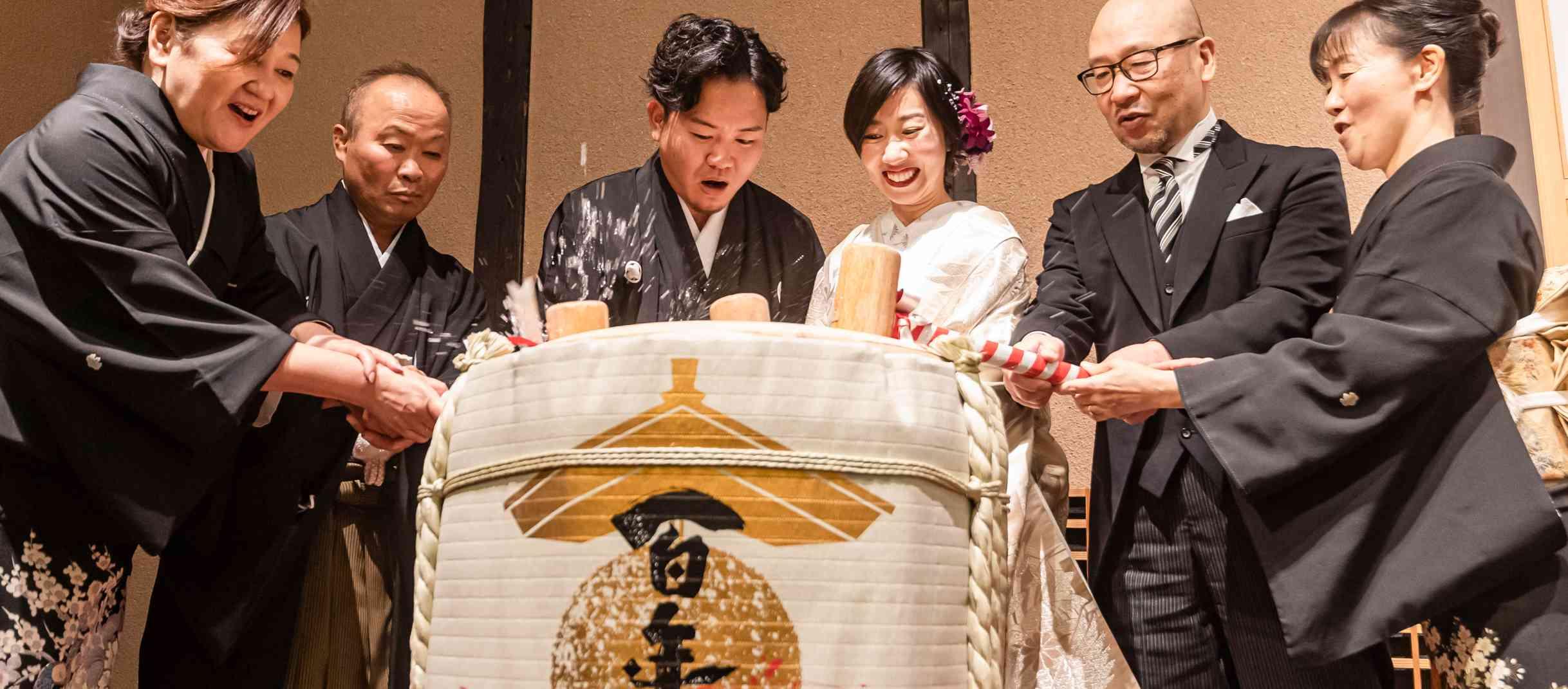 イチバン人気「鏡開き」のあとはゲストへの振る舞い酒、大杯を使用したカンパイ!縁日など博多百年蔵オリジナルの演出でゲストへおもてなし