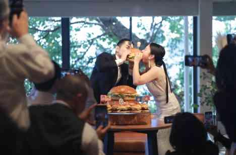 BIGハンバーガータワー!!! お二人が大好きなハンバーガーにかぶりつきました!!! 豪快にかぶりつく姿がお二人らしさ満載でゲストもほっこり~! ハンバーガーについているフラッグはお二人の天使♡ カラフルなオリジナルフラッグがハンバーガータワーにマッチしています! 準備は子育てとの両立で大変なことも多かったことと思いますが、とっても素敵なファミリー婚でした♡