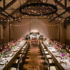 模擬披露宴 【プライベートガーデン付き】素朴とすら感じる白い塗り壁と古材で組まれた天井の梁が、ナチュラルな風合いを醸すパーティ会場。ふたりらしさも少し加えて、この日だけの温かで特別な場所に仕上げる。