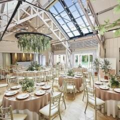 【庭を一望する会場】素朴とすら感じる白い塗り壁と古材で組まれた天井の梁が、ナチュラルな風合いを醸すパーティ会場。ガーデンでのケーキカットやデザートビュッフェ、ガーデン入場など庭を使った演出も人気