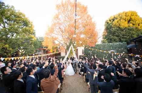 冬の時期でもゲストに囲まれながらあたたかいセレモニーを。ゲストのことも考え、ひざかけやカイロなどの気配りは必須。ゲストの中には冬のガーデンもいいねとのお言葉も飛び交う。フィナーレには新郎新婦に向けたお祝いのフラワーシャワーではなく、ゲスト全員の幸せを祈って一斉にフラワーシャワーを!