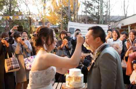 挙式後のガーデンでのカクテルパーティー。ゲストとのお時間を過ごしながら、お二人からのケーキセレモニーを。ガーデン全体を使えるのでゲスト全員に囲んでいただきながらお二人のセレモニーを見守っていただける。流行りのネイキッドケーキに金箔で上品さをプラス!!