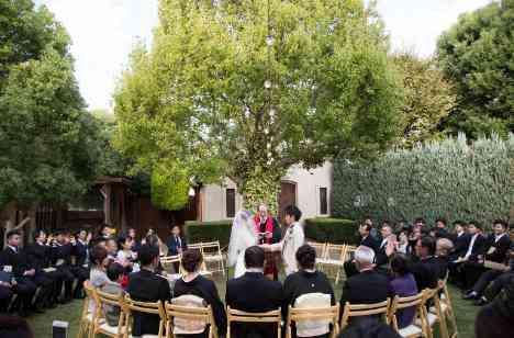 青空の下でのガーデン挙式。解放感のあるガーデンだからこそゲストもリラックスでき、お二人を温かく見守ることができる。いままでお世話になった方々全員につくってもらったお二人の未来を表すバージンロード。夫婦としての誓いを皆様に見守っていいただく。